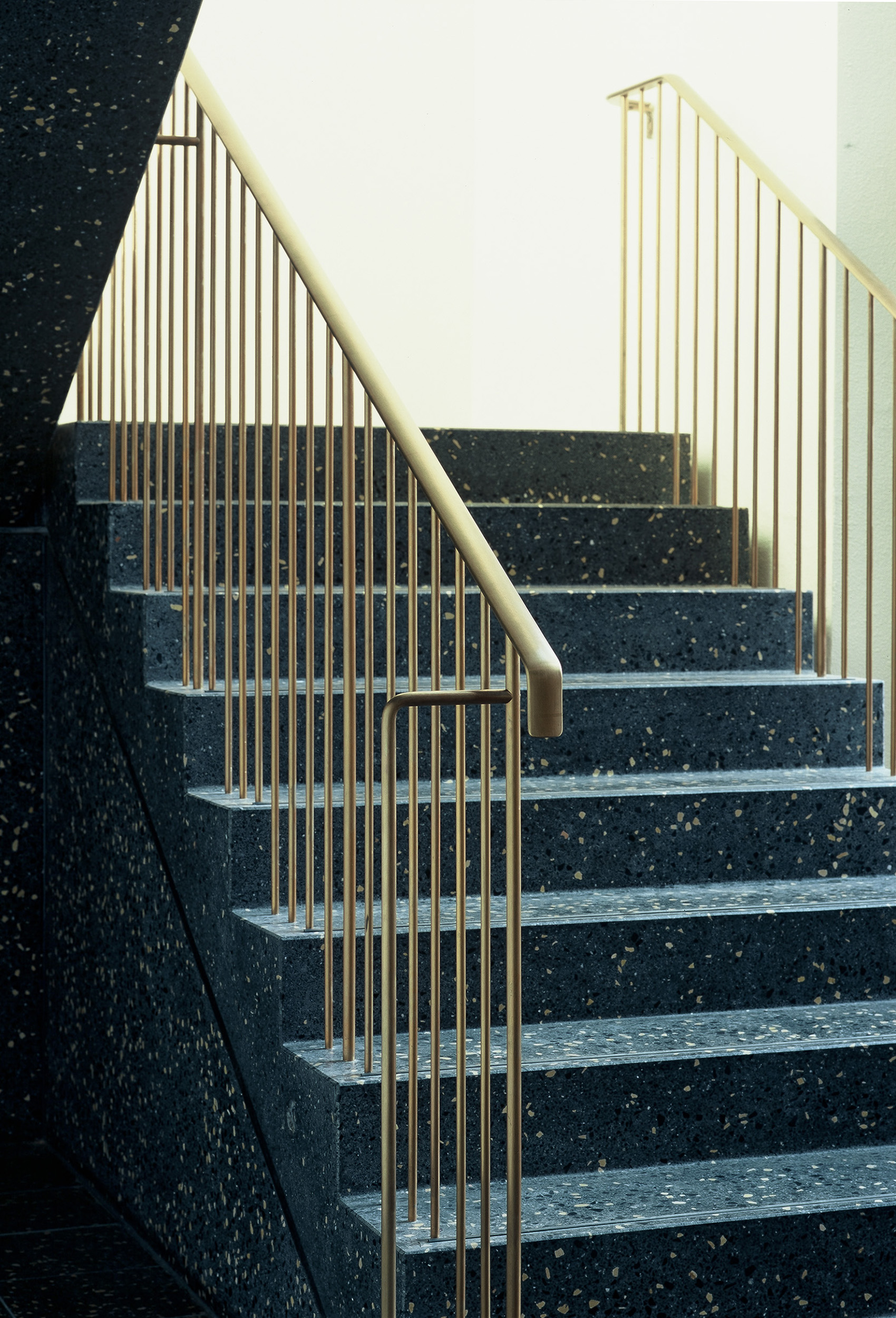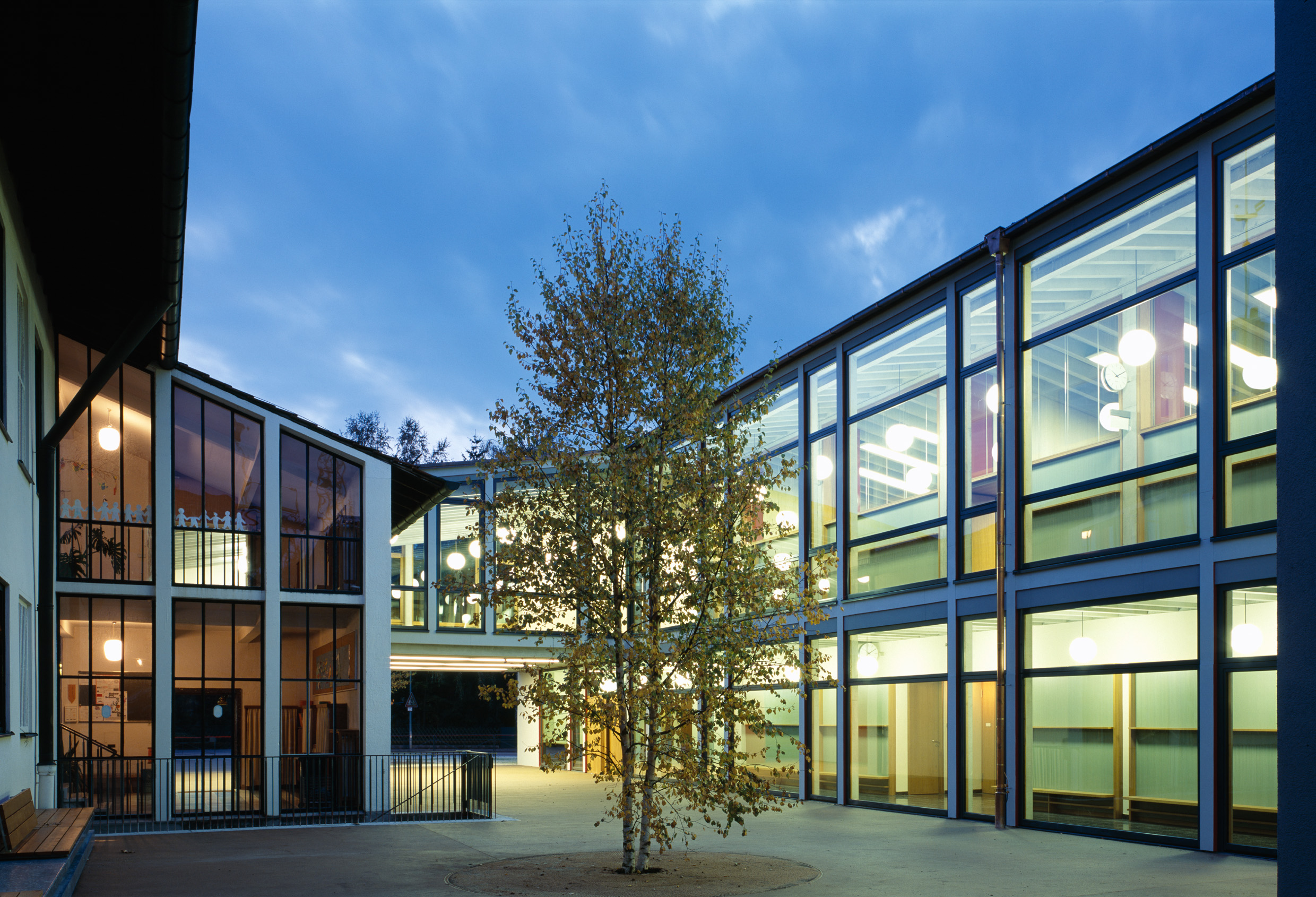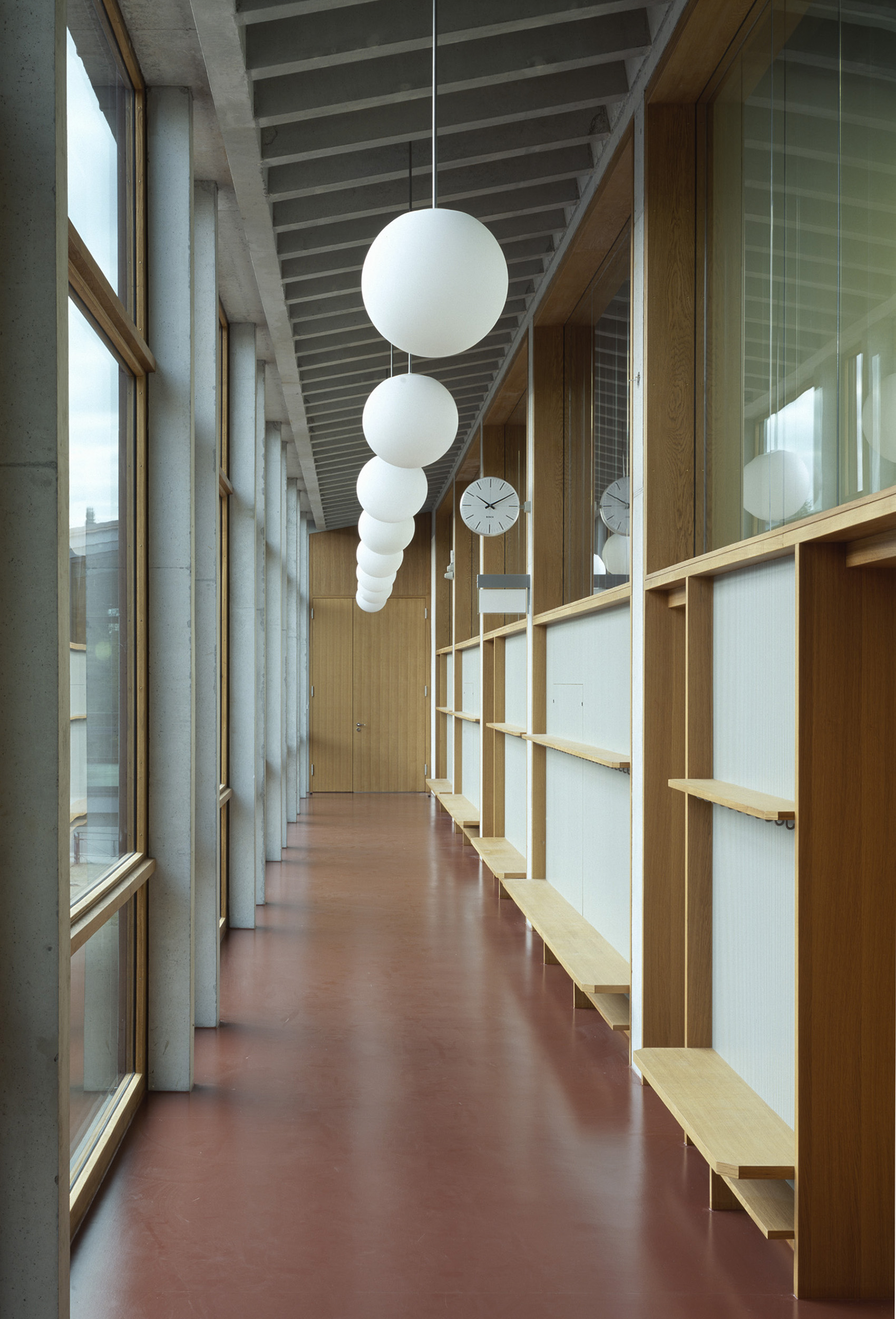 Der Charakter und die räumliche Struktur der 50er Jahre galt es zu erhalten, dabei aber den Anforderungen an einen modernen Schulbau gerecht zu werden. Die alte Aula blieb erhalten, gleich einem Wintergarten, mit einem Zwischenklima von Innen nach Außen. Neue Einfachsicherheitsscheiben in alter Stahlglasfassade ermöglichten den Erhalt der alten, ungedämmten Betonskelettkonstruktion.Treppe und Aula in gelbem Terrazzo, gebürstete Stahlgeländer, Eichenglastüren natur, Linoleumböden in ursprünglichen Rot, alte feinporige Wandputze schaffen eine Stimmung wie zur ersten Schuleröffnung mit einem Frühlingsflair von Heute.