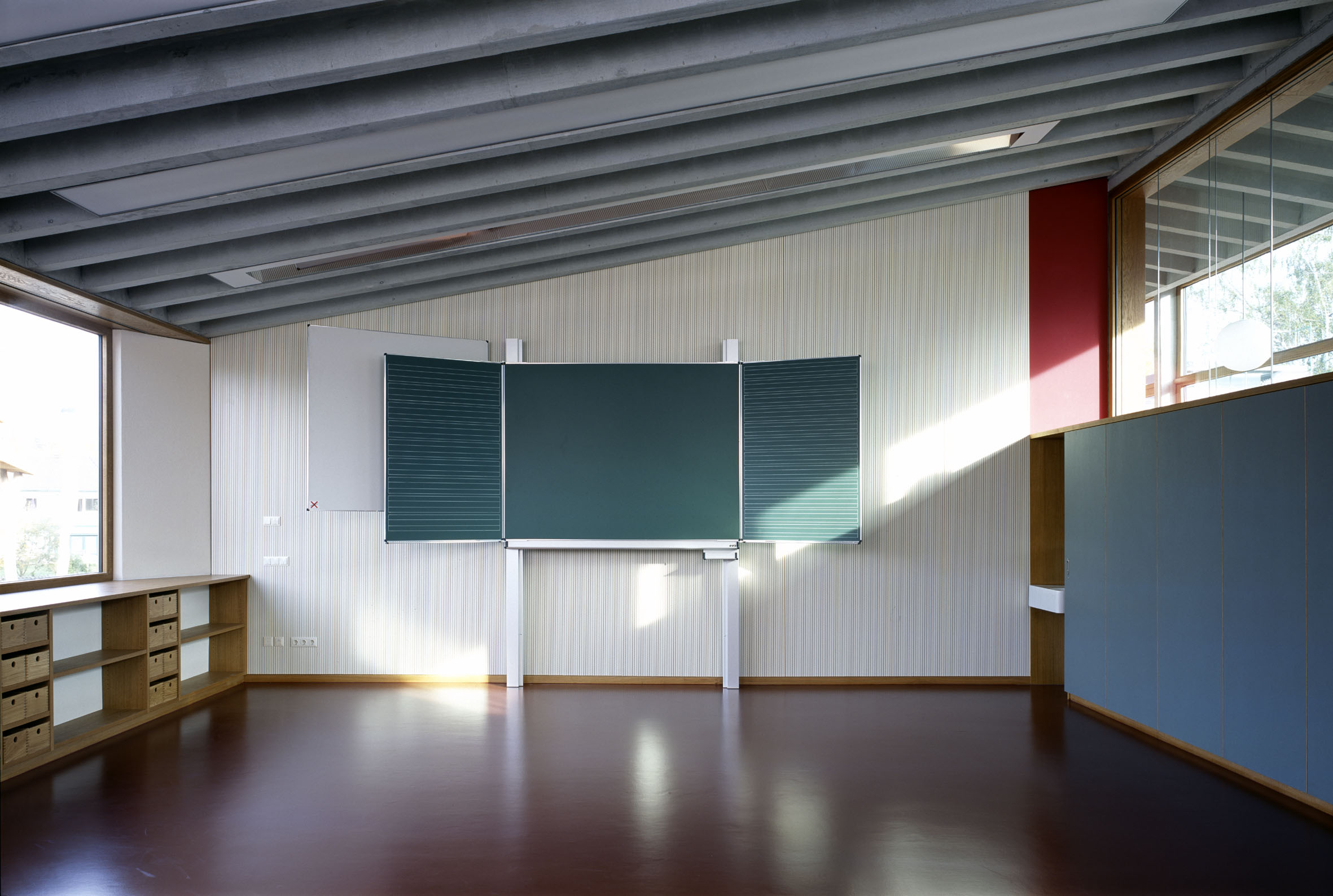 Technisch erneuern - Stimmung erhaltenZeitgleich mit der Matthäus-Kirche am Sendlinger Tor baute Gustav Gsaenger 1957 die Dorfschule in Schondorf am Ammersee. Mit bescheidenen Mitteln der Nachkriegszeit schaffte Gsaenger ein lichtdurchflutetes Raumerlebnis, welches in Stimmung, Oberfläche und Materialwahl erhalten werden sollte.