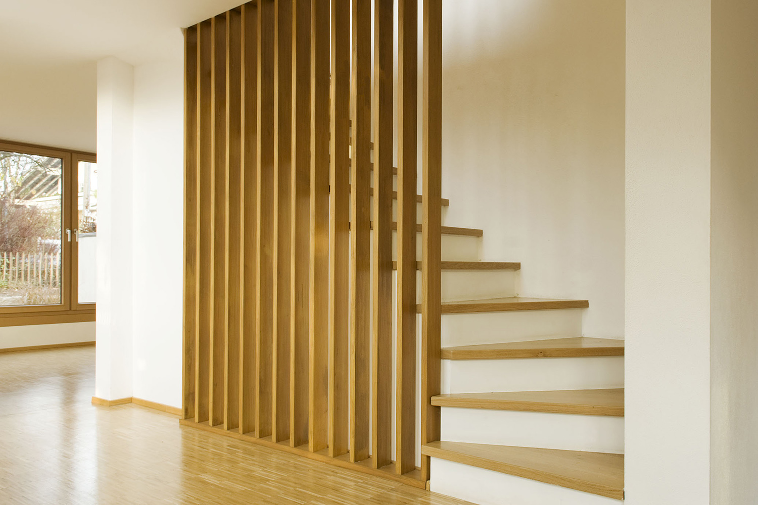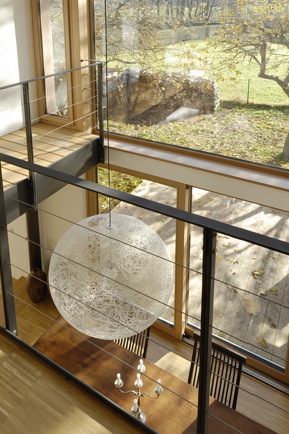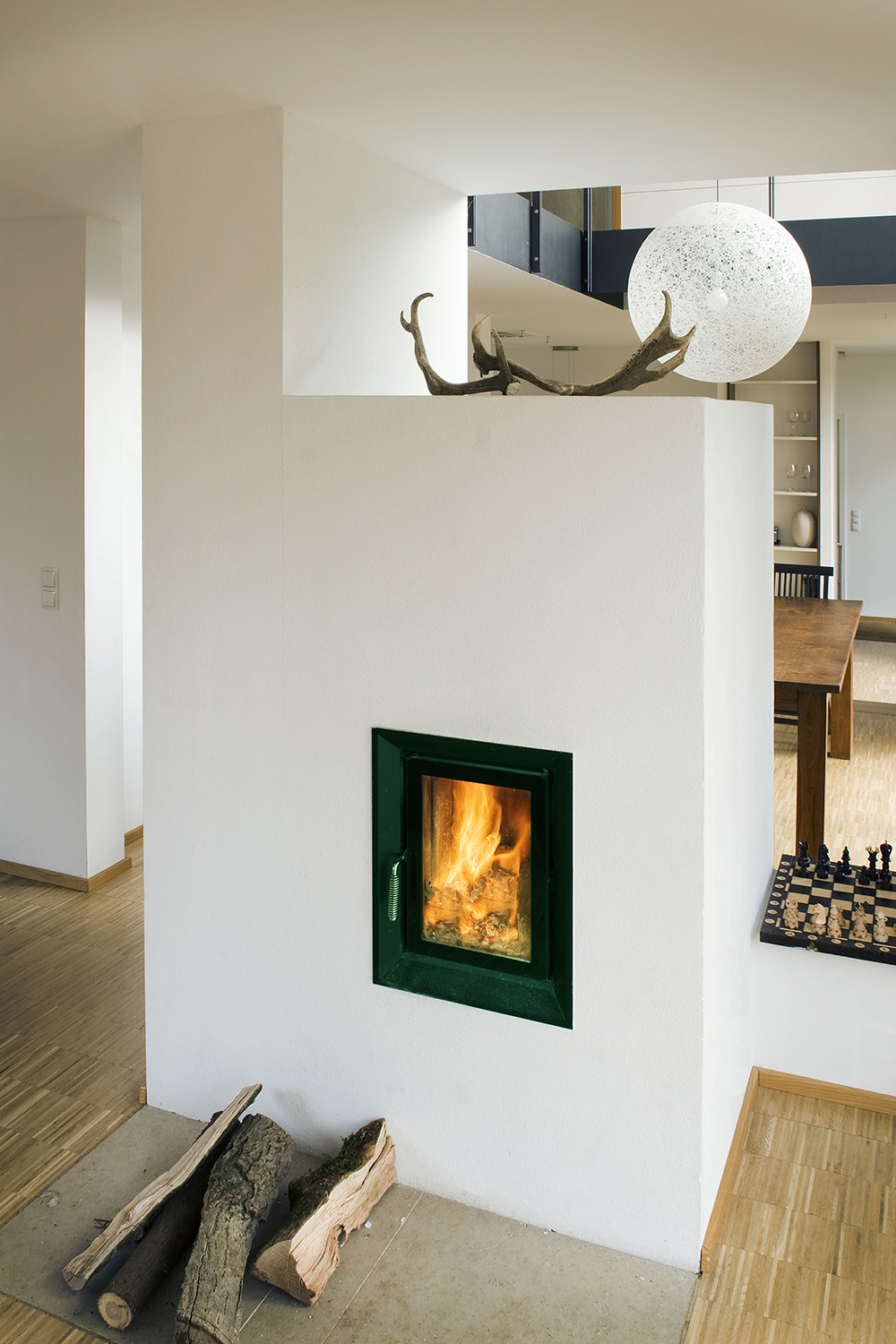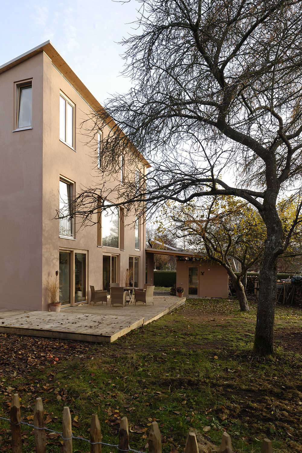 Die Familie Bornhöft mit 3 Kindern wünschte sich ein kompaktes Haus, welches viel Raum im alten Apfelgarten belässt. Die Gestaltung sollte modern und wohnlich sein, mit einem möglichst offenen Raum für die Familie am Garten. Es entstand ein Haus mit Pultdach, welches sich über grosse Schiebefenster zum Garten nach Süden öffnet. Der zentrale Raum mit Esstisch ist überhoch und verbindet das Haus in der Horizontalen, den Familienräumen im Erdgeschoss und in der Vertikalen, zum oberen Geschoss.Das Haus wird ausschliesslich mit dem im Wohnzimmer angeordneten Kachelofen und den Sonnenkollektoren auf dem Garagendach beheizt. Die Heizverteilung ist eine Fussbodenheizung, welche über Wärmetauscher an den Kachelofen angeschlossen ist.