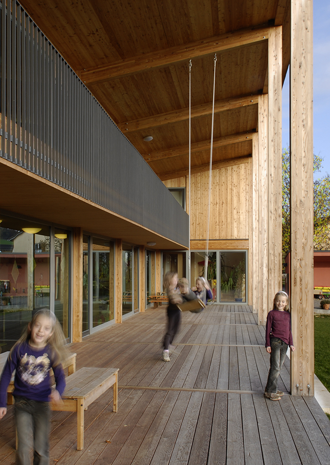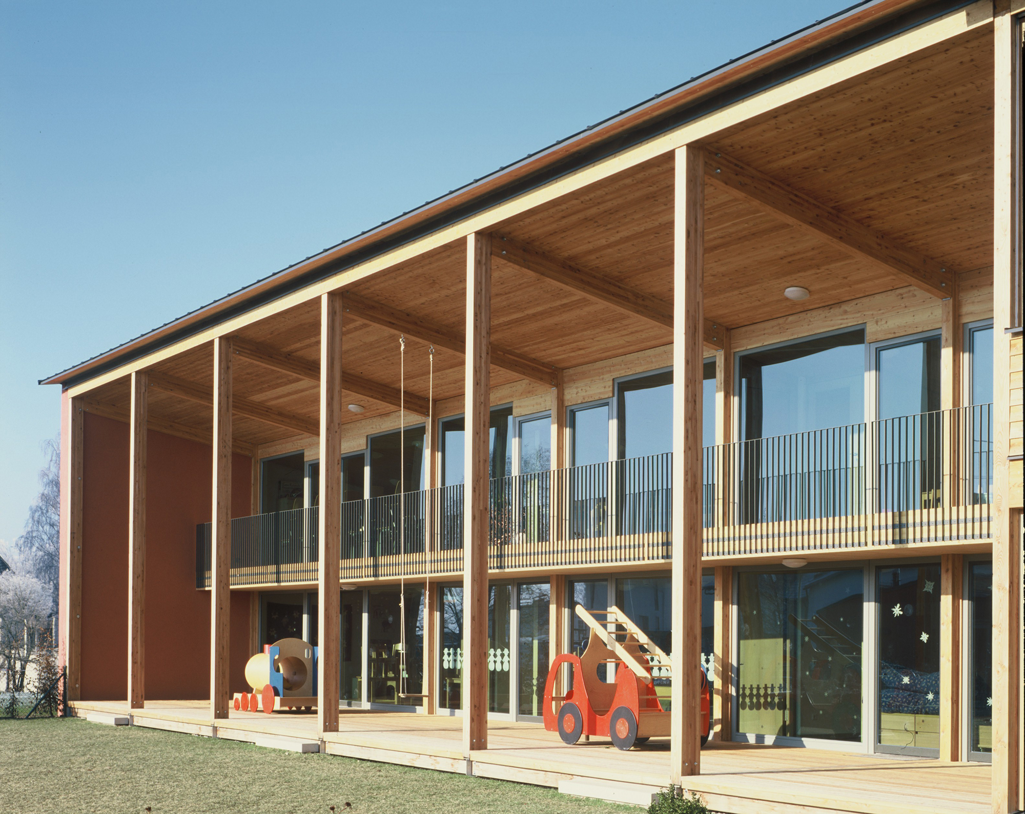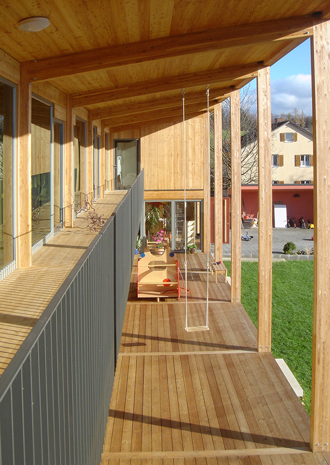 Mauerwerksschotten bilden die Tragstruktur des Gebäudes, Massivholzplatten in Lärche fachen die Längsseiten aus. Die hölzerne Dachkonstruktion nützt die statische Höhe zum Dämmen für einen sehr guten U-Wert. Der tiefe Terrassenraum nach Süden dient bei schlechter Witterung als überdachter Aussenspielbereich und sorgt im Sommer für die nötige Verschattung. Im Winter dringt die Sonne zur passiven Nutzung der Sonnenenergie tief ins Gebäudeinnere ein. Eine kontrollierte Be- und Entlüftungsanlage sorgt für eine gute Raumluft und einen guten Energiehaushalt. Das benachbarte BHKW versorgt den Kindergarten mit Wärme.