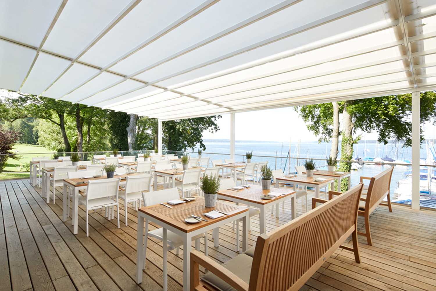 Zum See entstand so ein neuer Saal mit raumhohen Schiebefenstern und einer prächtigen Ausstattung. Oberhalb des Saales konnte eine große Dachterrasse, direkt an das Tagesrestaurant angegliedert, errichtet werden. Größte Herausforderung war aber die Anbindung des Hauses an die Seepromenade, denn der Schottenbau der 60er Jahre ließ keine Verbindung nach Süden zum Dorf Bernried und dem Seeweg zu.