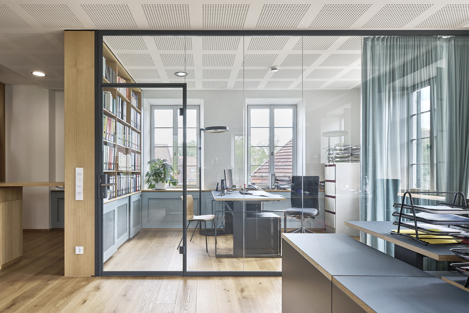 Der Aufgabenschwerpunkt war die Sicherstellung des reibungslosen und effizienten Arbeitsablaufs der Verwaltung. Die Mitarbeiter möchten weiterhin im Team zusammenarbeiten, sich gegenseitig sehen und bei Bedarf unterstützen. So kam es zu der Umsetzung mit den Glastrennwänden innerhalb der Großraumbüros. Diese bieten Ruhe und Rückzug für vertrauliche Gespräche mit Bürgern und Mitarbeitern, aber auch für Telefonate und konzentriertes Arbeiten. Die hochwertige Ausstattung mit Schränken, Akustikdecken, Holzoberflächen und ruhigen Farben, sorgen für eine gute Arbeitsatmosphäre.