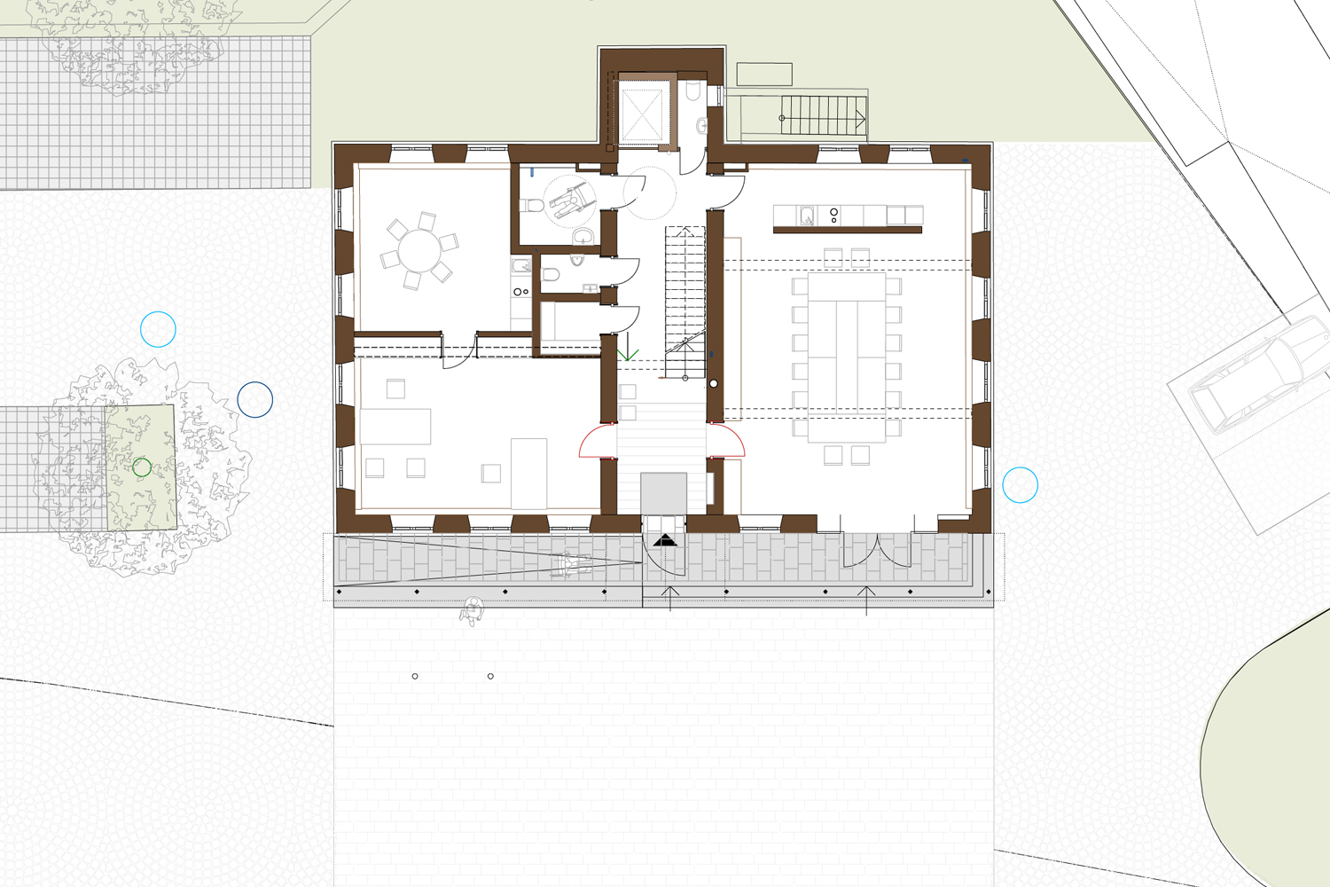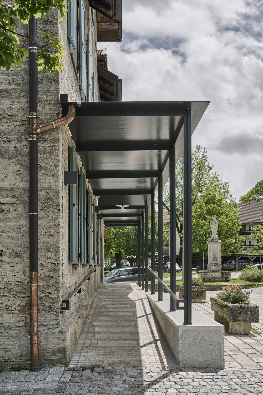 Das Vordach aus schwarzem Stahl und der moderne Treppeneinbau im Inneren heben das Haus auch optisch in die moderne Zeit. Der Tuffstein der äusseren Hülle und die behutsamen Eingriffe in die Gebäudestruktur erweisen den Respekt vor der Geschichte.