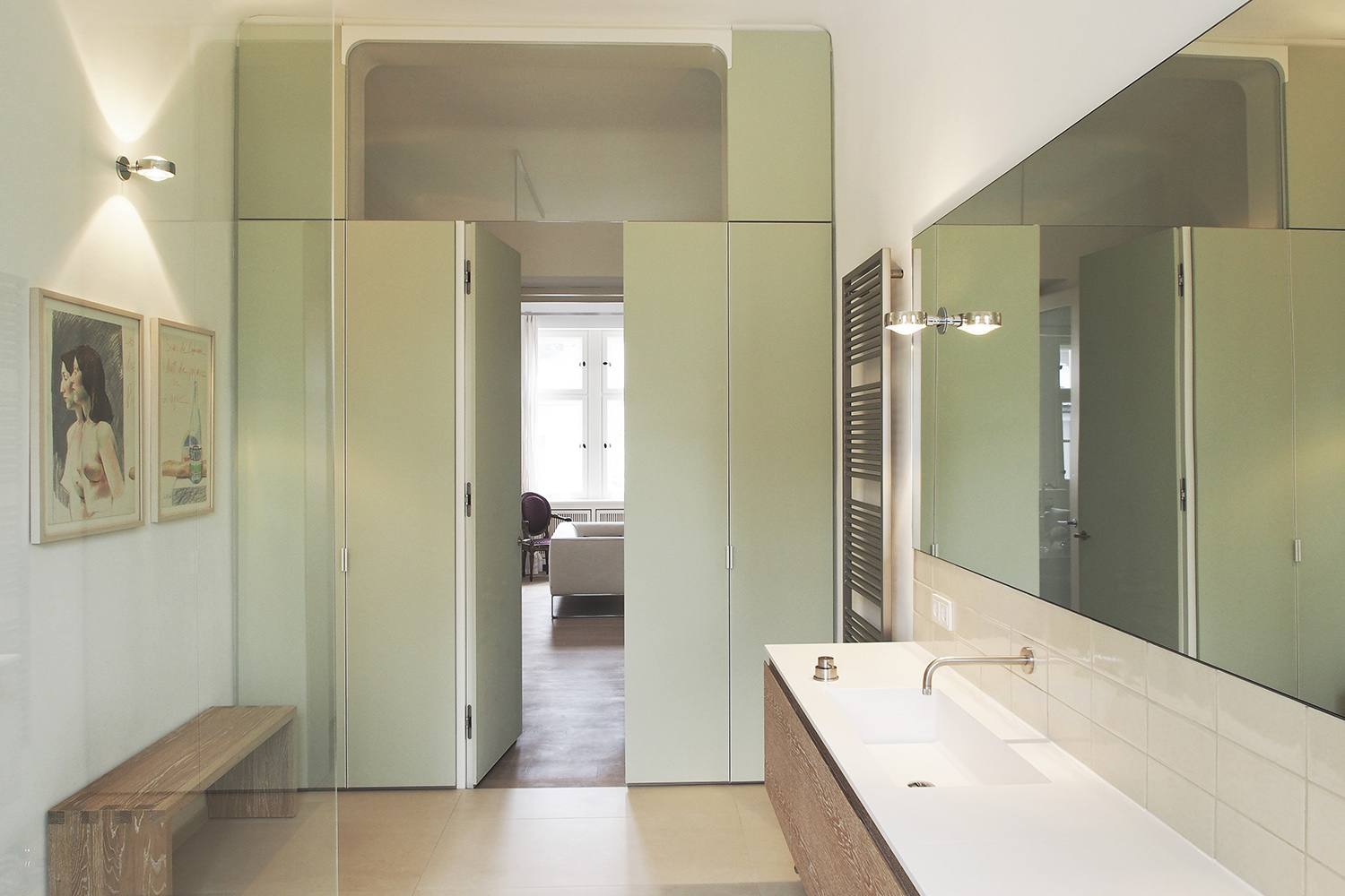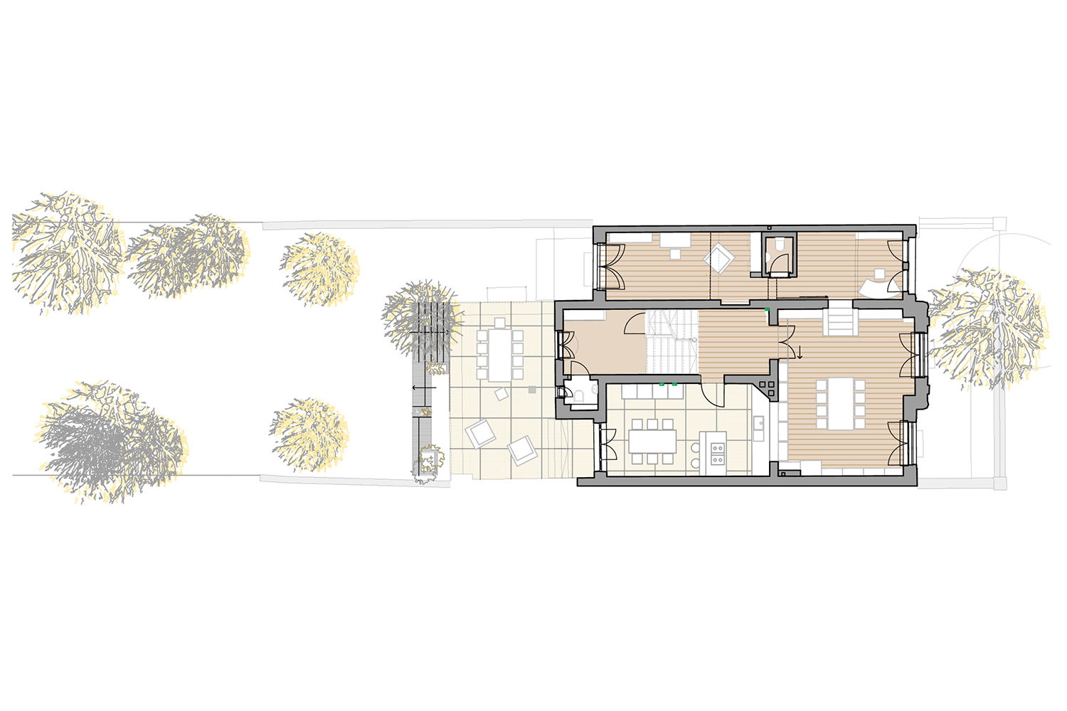 Während die Strassenfassade bereits restauriert worden war, sollten im Inneren neuzeitliche Einbauten entfernt werden, Bäder und Küchen modernisiert, alle Wohn- und Schlafräume einer schlichten zeitgemäßen Gestaltung zugeführt werden.Für die Fassade der Gartenseite wünschten sich die Bauherren ebenfalls einen Rückbau früherer Eingriffe und eine gestalterische Vereinheitlichung der sehr heterogenen Fensteröffnungen. Die Öffnungen wurden subtil vergrössert, um mehr Licht in die nach Norden zeigenden Räume zu bekommen, die Fenster weisen eine feingliedrige Teilung auf, ohne ein historisches Bild zu imitieren.